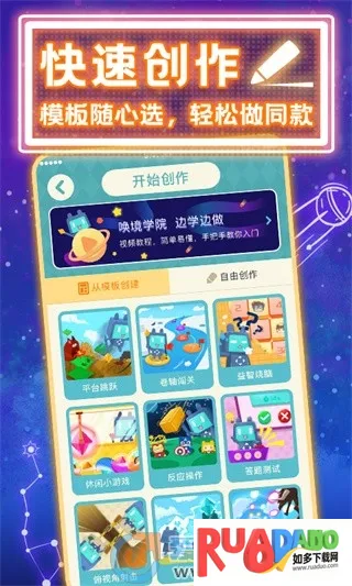 1、唤境安卓版手机版降低了游戏制作门槛,用户无需编程知识,有创意就能开始制作,平台内置智能事件系统处理游戏逻辑,让创意轻松转化为游戏。