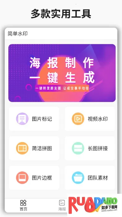简单水印是厦门新历网络发行的美图制作软件,有丰富水印工具与海报素材。支持批量水印、文字图片水印,能自由管理处理。有智能模板,可自定义内容,还能团队编辑、图片拼接,操作方便。