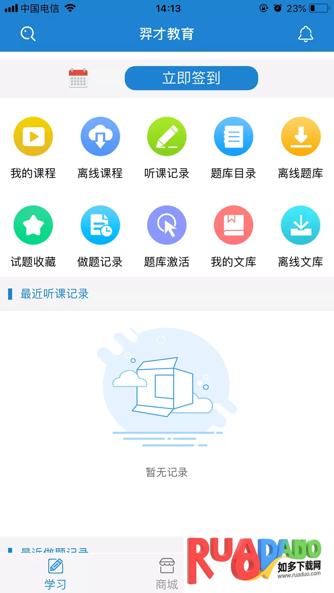 3、功能很丰富:有羿才网校、图书商城、羿才文库、羿才题库等板块,支持直播回看、课程回放,手机与电脑学习记录同步,能实现听课、做题、文库下载、图书购买等综合性学习。