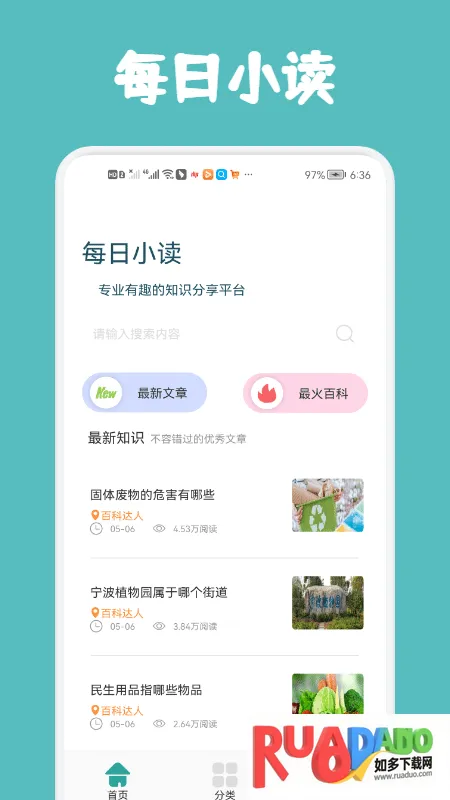 4、是能日积月累提升自我的碎片化阅读轻阅读应用,提供丰富百科知识点和最新资讯,还能设置阅读计划,每天打卡阅读。