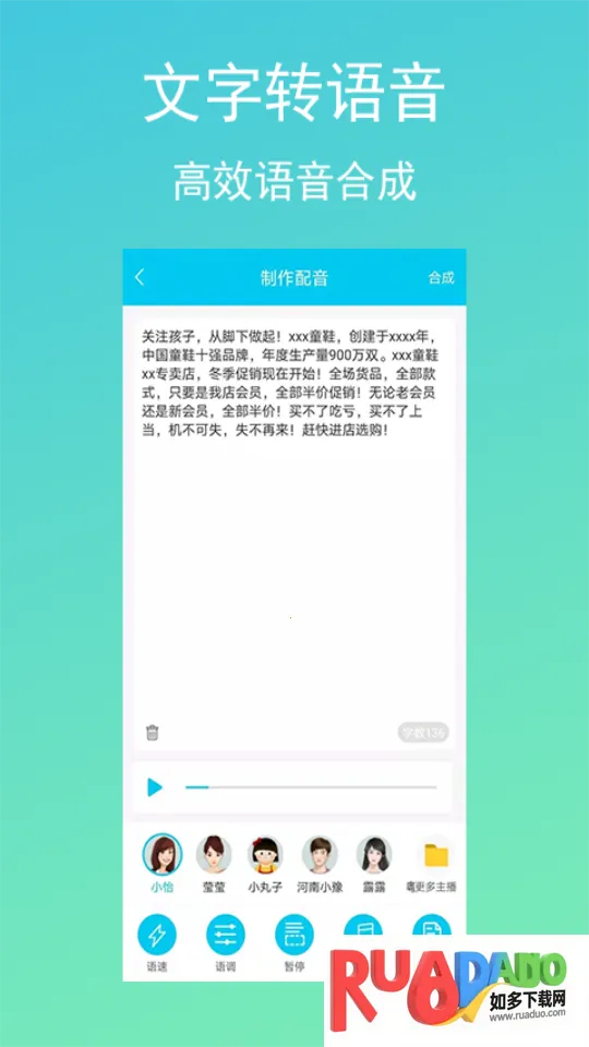 1、主播选择多样:有男声、女声、童声、方言、英文等不同风格发音人可供选择,满足多元需求。