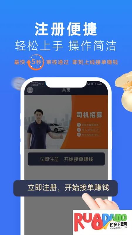 1、海量订单自由接:平台拥有海量订单,司机可根据自身时间自由安排接单,随时都能开启接单模式。