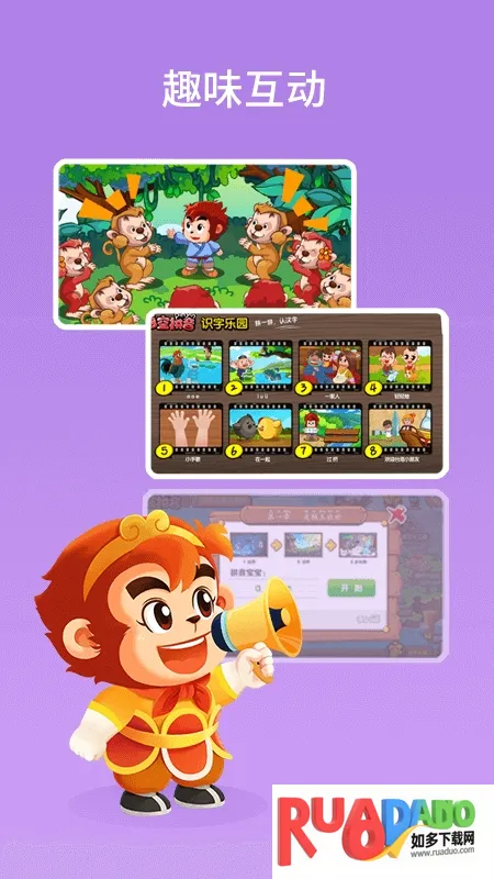 1、以 悟空学艺 为故事背景,包含 14 天西游故事和 42 个趣味游戏,让孩子边听故事边学习拼音,增添学习乐趣。
