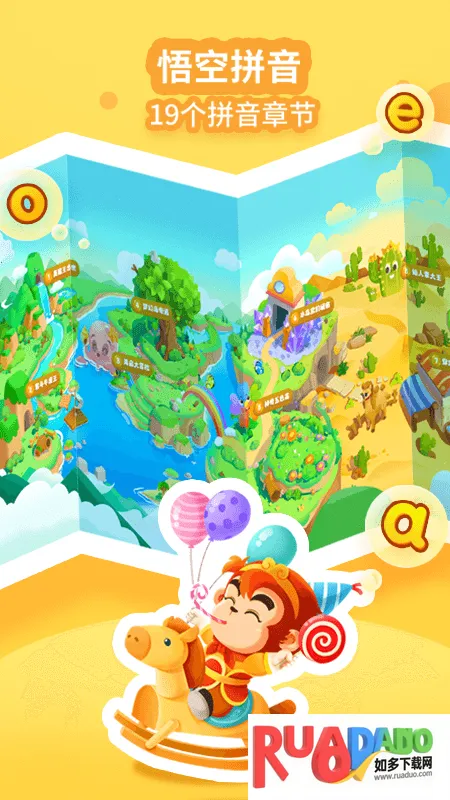 1. 悟空拼音专为学龄前儿童打造,按一年级拼音教学方案编排课程,有42个游戏、14天学习内容,以悟空学艺故事为背景,让孩子边听故事边快乐高效学习。
