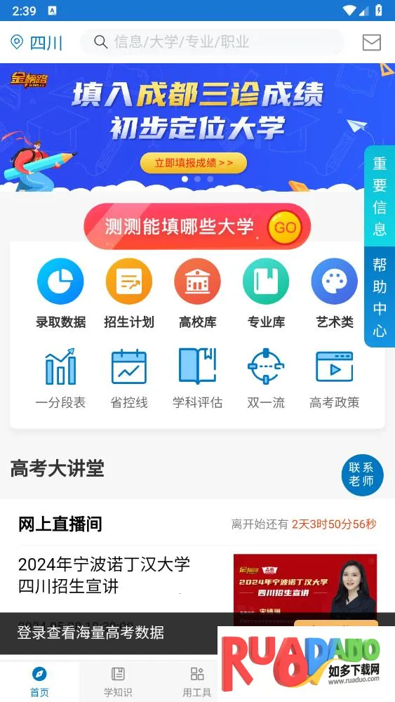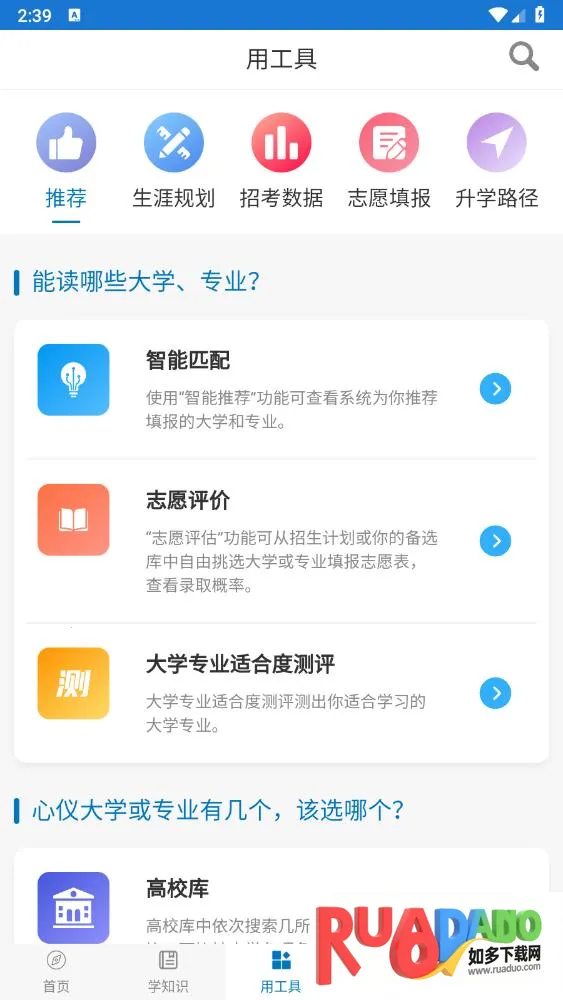 1、适合填报高考志愿的高三学生和家长使用,能帮助学生根据成绩选学校,囊括所有高校历届升学信息,输入模拟成绩可智能匹配学校及专业。
