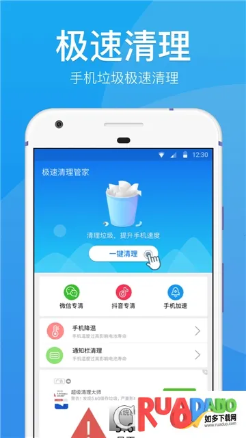 1、极速清理管家最新手机版能有效解决手机卡顿问题,它可一键清理无用垃圾文件,让手机内存保持最佳状态,运行更流畅。
