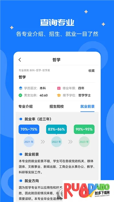 2、它能提供高校全景简介、专业设置等多维信息,帮助用户深度了解院校,精准锁定报考目标,每个大学专业都匹配招生院校名录与详细介绍。