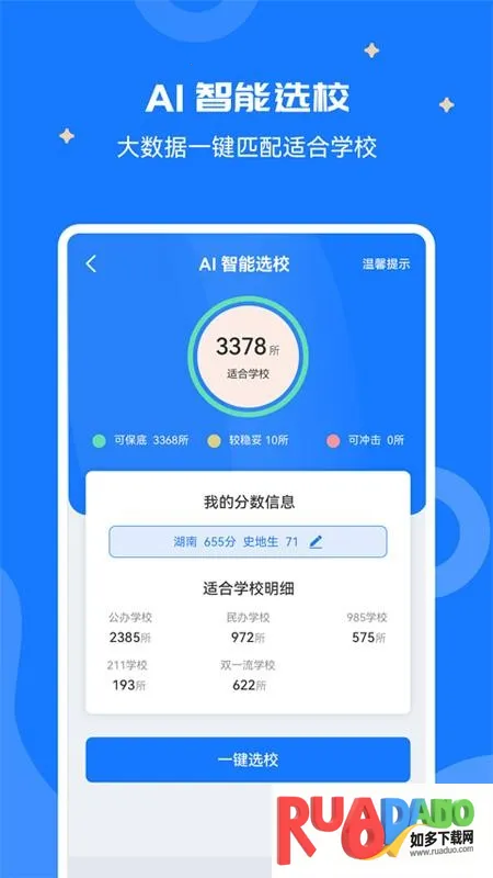 3、AI智能填报:运用人工智能算法分析用户成绩位次及意向,快速生成适配的志愿填报方案,涵盖冲 - 稳 - 保梯度建议。
