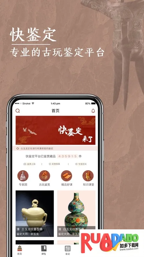 1、快鉴定是专业的古玩鉴定与学习交流平台,支持玉器珠宝等六大品类鉴定,知名鉴宝大师、资深行家等入驻,国家大师专业资质在线实时鉴宝,能让用户与专家零距离交流。