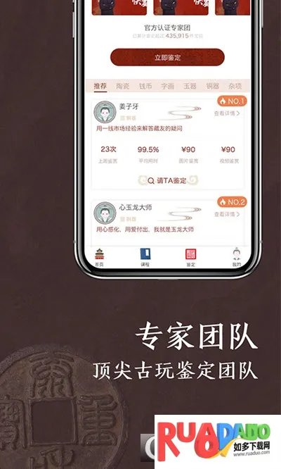 4、平台功能丰富,有搜索功能满足用户对古玩信息的需求,课程分类详细,能清晰看到课程费用,还有专家团版块可快速鉴定古玩。