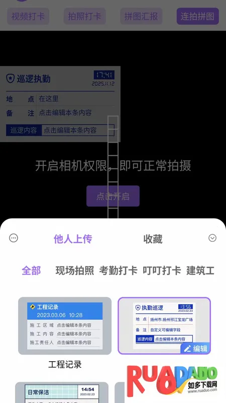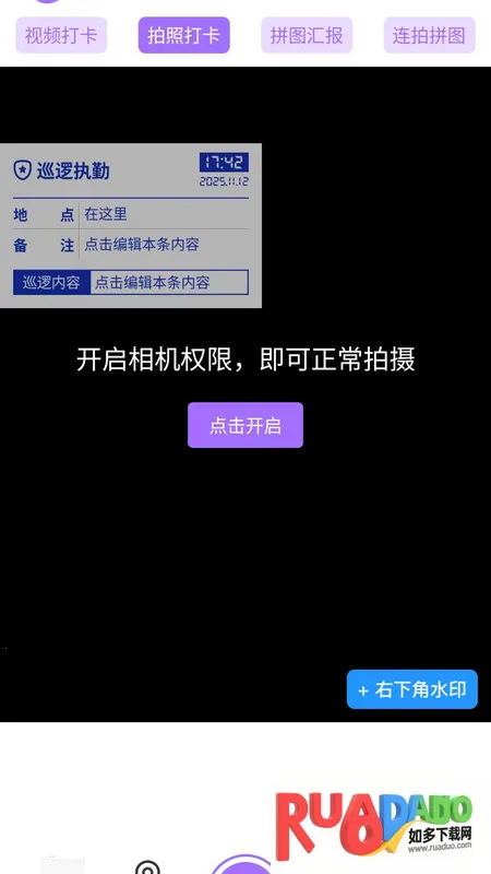 2、使用它拍照操作简单,安装进入 app 授予权限后,在水印板块筛选免费素材自由添加,结合编辑功能添加文字信息,完成设置就能拍摄带水印的高清图片。