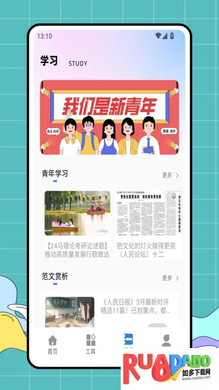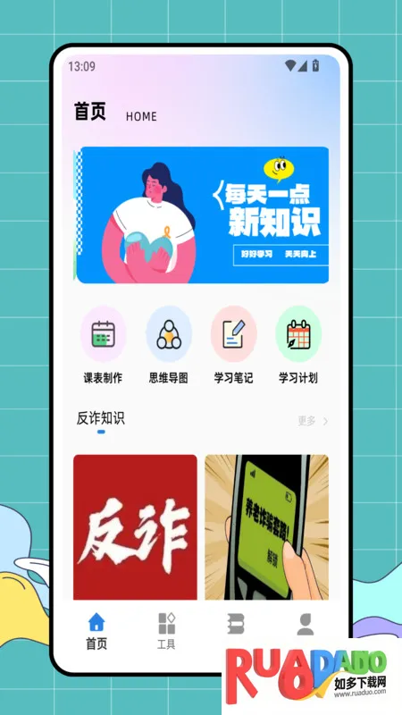 2、学习途径丰富,首页有课表制作、思维导图、学习笔记和学习计划,还能了解反诈知识;课程表可了解最新课件课程信息;工具页面有自习室、文档编辑等版块,还能知晓法治思想;学习页面可进行青年学习和范文赏析。