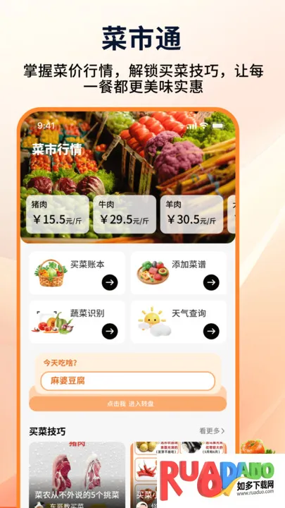 3、具备实用工具,能轻松掌握菜价行情,有蔬菜识别、天气查询等,让买菜更实惠便捷。