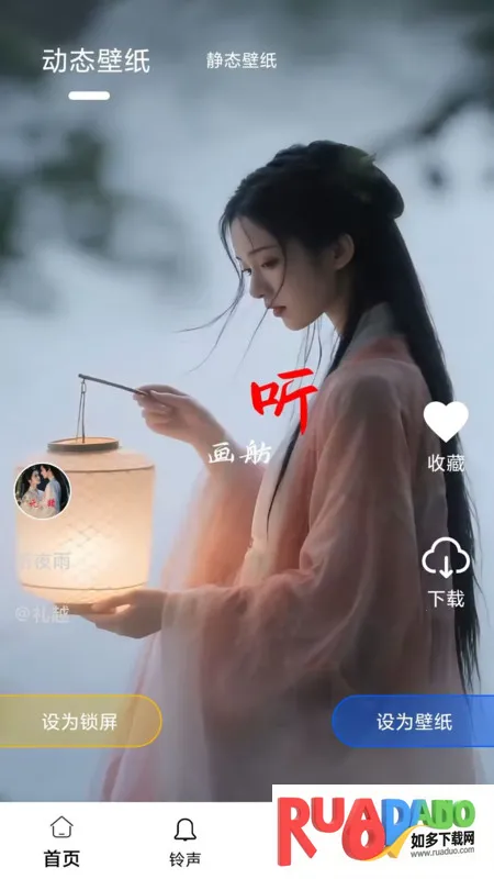 2、查找便捷高效:在首页能随时设置动态或静态壁纸为锁屏或壁纸;在铃声页面可找到热门国风古风纯音乐;在搜索页面输入关键字就能搜索喜欢的铃声进行播放、下载或设为铃声。