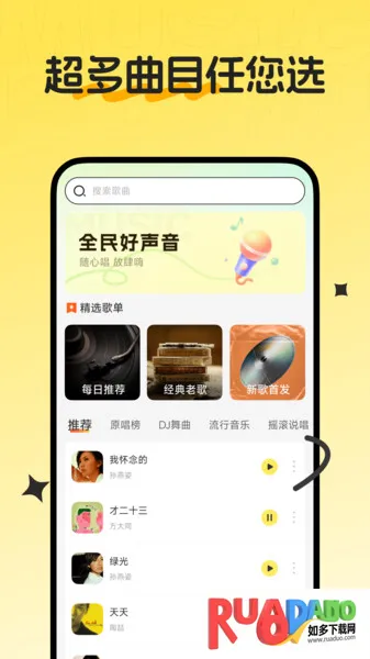1、歌曲资源海量:涵盖国内外热门、经典老歌及新上线歌曲,类型丰富,满足不同用户多样化需求。