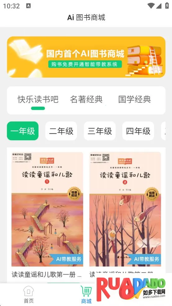 3、图书商城按年级和类别分类,语文学习板块丰富,有 同步课文、分级阅读、作文写作、古诗古文 等,提供多样学习资源。