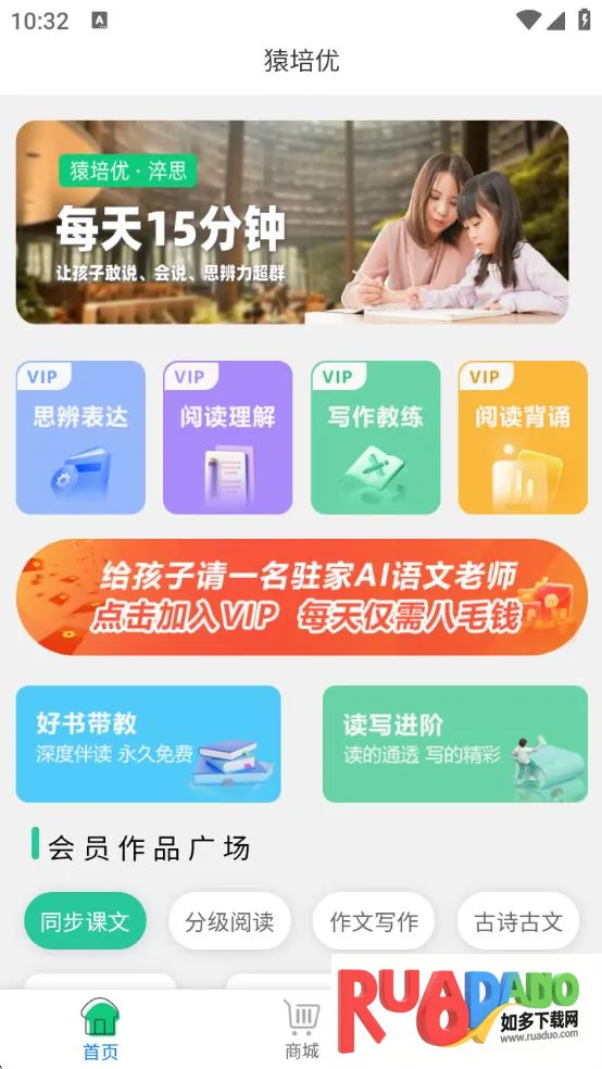 1、猿培优涵盖快乐读书吧、名著经典、国学经典等多类图书资源,其图书商城按年级和类别分类,语文学习板块有同步课文、分级阅读、作文写作、古诗古文等,提供丰富的学习作品资源。