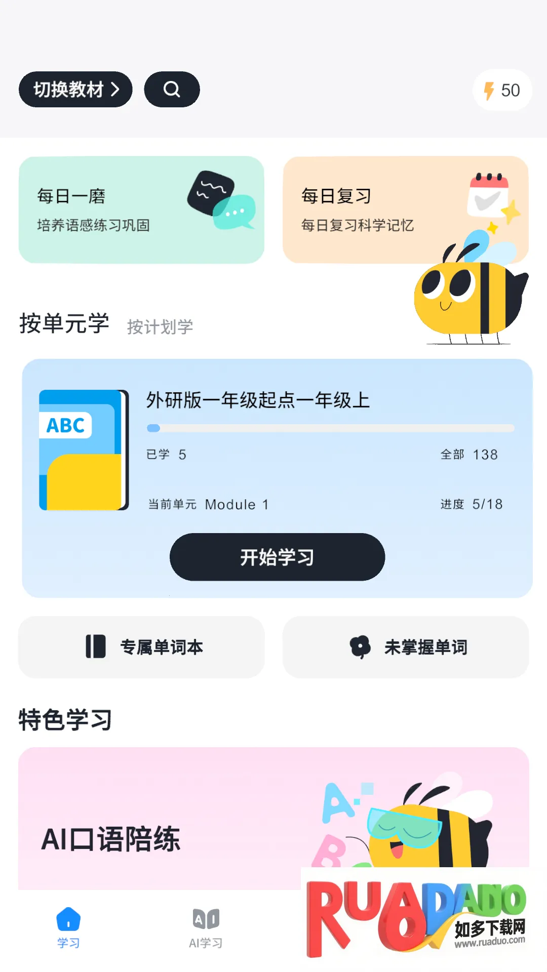 4. 教材同步实用性强,支持切换教材,有外研版一年级起点教材,可按单元推进学习进度,满足学生同步课堂学习需求。