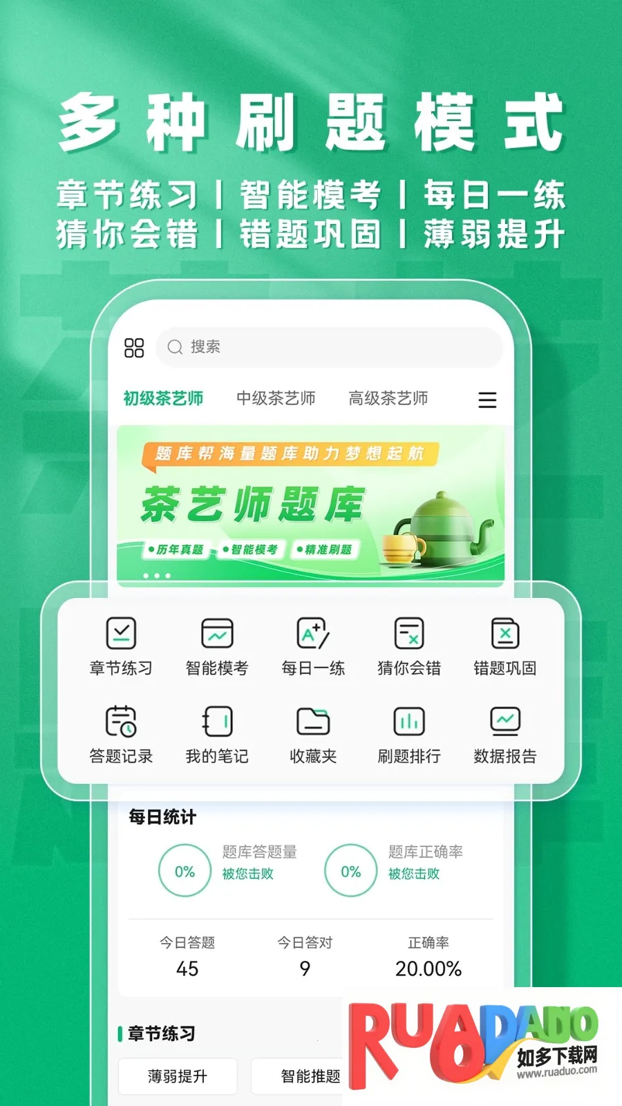 茶艺师题库帮是一站式茶艺师备考软件,提供全面服务。有多样化题库,精准覆盖考点,题型全。能自动整理错题,有多种刷题模式、专项练习等功能,还可统计数据,覆盖不同等级备考资源。