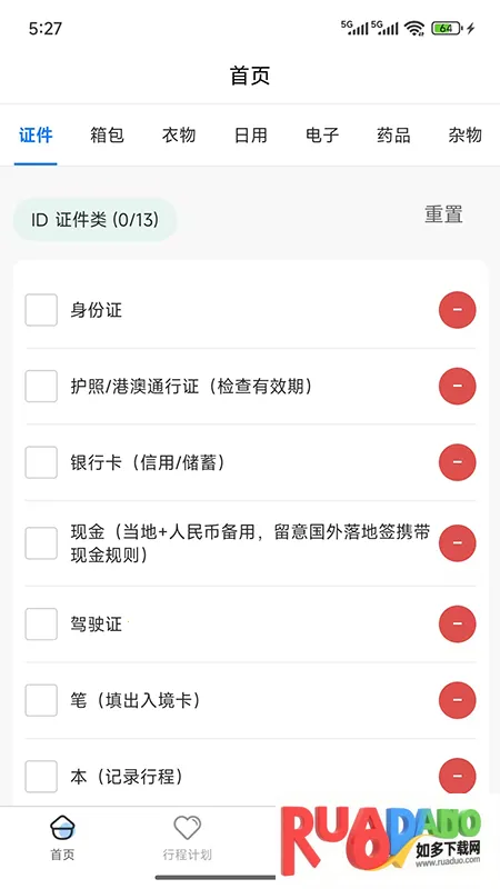 2、物品分类全:涵盖证件、箱包、衣物、日用、电子、药品、杂物等类别,确保出行物品准备无遗漏。