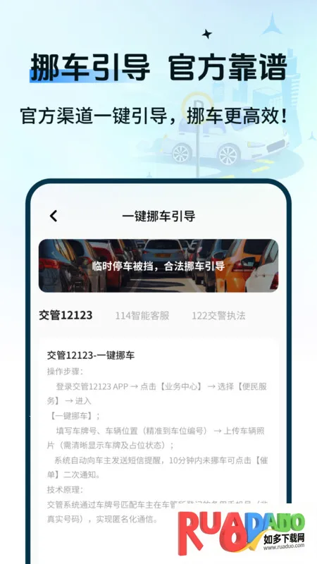 3、该软件以临时停车码为核心,解决了传统挪车中隐私泄露和沟通效率低的问题,智能挪车引导功能无需尴尬沟通,能通过多种渠道快速发起挪车请求。
