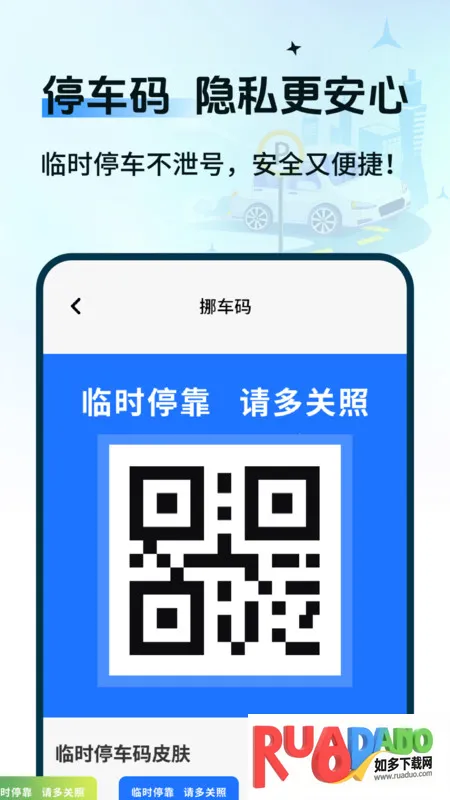 1、具有 独创临时停车码,可将真实电话号码加密成二维码,他人扫码通过虚拟号码联系,有效保护用户隐私,避免因留电话带来的骚扰和信息泄露风险。