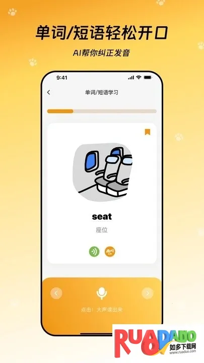 2、融合 智能技术,实现整句对话模拟与发音纠正,模拟真实交流场景并及时反馈,提供沉浸式英语练习体验,帮助用户快速提升口语表达与思维能力。