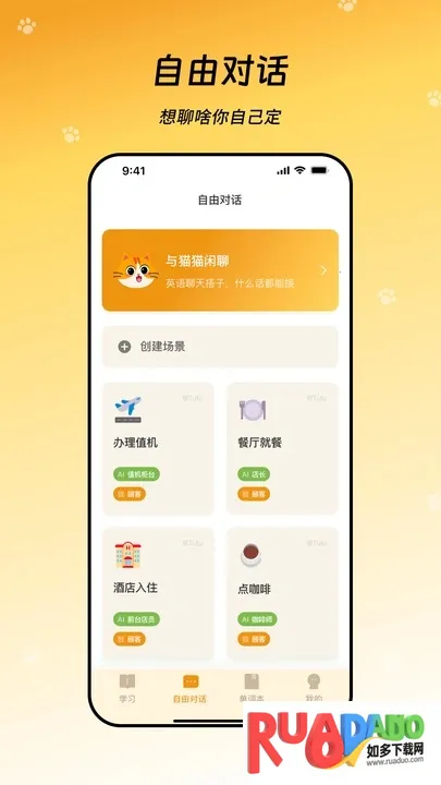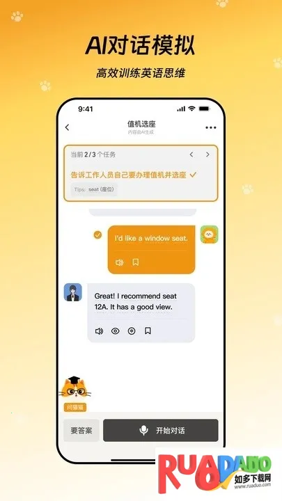 1、猫猫口语助力高效提升英语应用能力,满足用户从基础到应用的学习需求,帮助在实际场景中掌握交流技能。