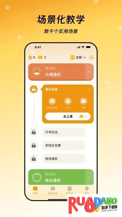 1、以 场景化教学 为核心,打造数千个实用英语场景,让用户在真实语境中学习英语,所学内容可直接应用于实际交流。