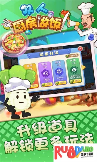 4、游戏乐趣无穷,操作简单,氛围轻松欢乐,还能升级厨房和角色属性,解锁更多玩法。