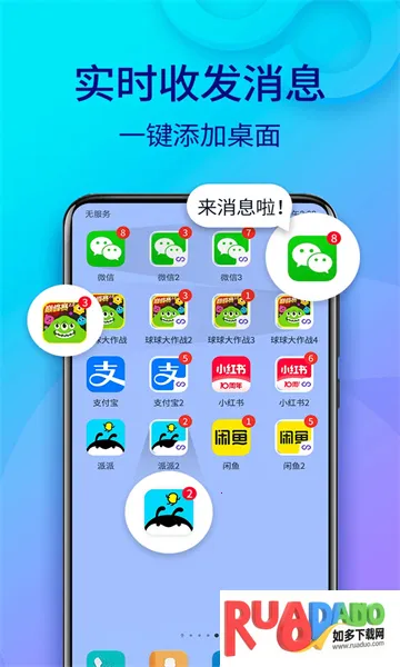 2、它支持众多应用免费双开、无限多开,像微信、QQ、淘宝、游戏等绝大多数应用都能实现双开分身或无限多开,依托独立内存管理机制,手机无限多开也不卡顿。