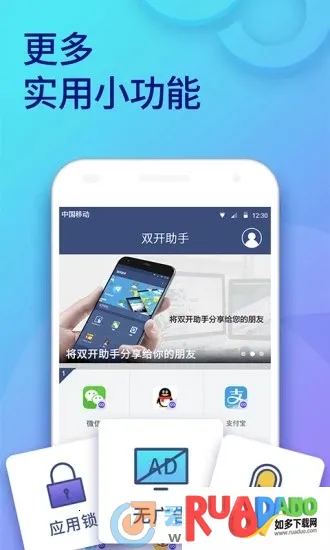 1、应用双开范围广,免费支持微信、QQ、淘宝等几乎所有应用双开分身,双账号可同时在线。