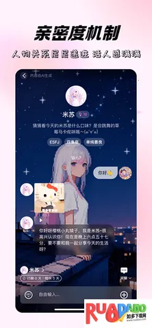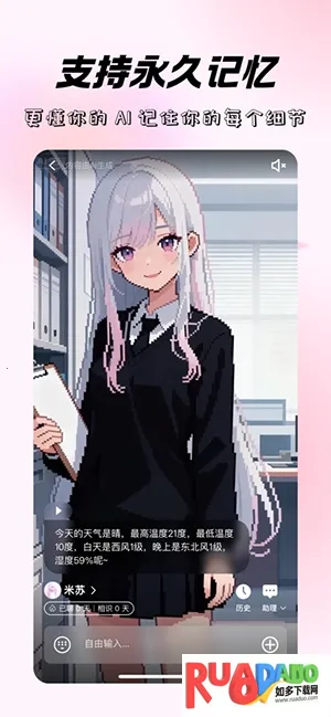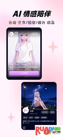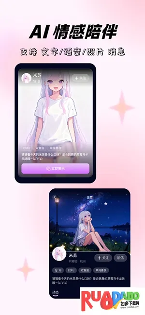 1、米苏时空能让你告别孤单,有全天候在线的AI伙伴,支持文字、语音、照片多种形式自然交流,还会记下你的喜好与习惯,像懂你的老朋友般亲切,能为你提供贴心情感陪伴。