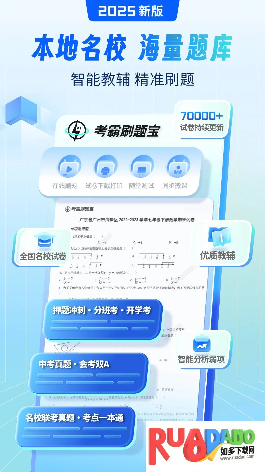 1、海量试卷资源:软件内有来自全国各地不同地区的试卷,题库充足,涵盖所有学习科目,如数学、历史、科学等,可让用户自由按需选择,实现一站式学习。