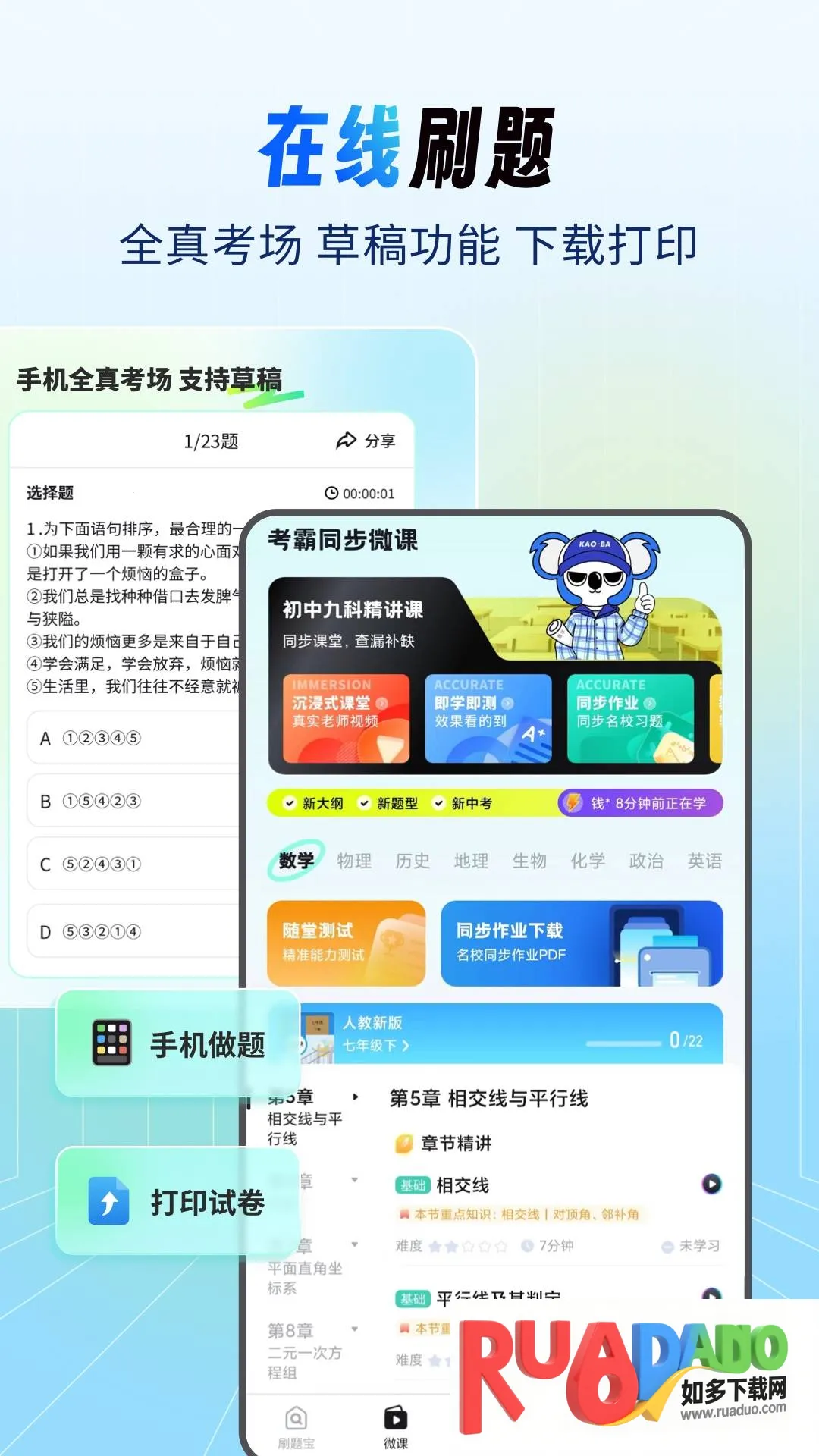 初中试卷宝是面向初中生的学习软件,有丰富模拟习题和科普知识。具备拍试卷清笔迹、拍错题整理、搜题等功能。有充足题库,能整理错题、添加标签,支持蓝牙打印,隐私有保障,界面简约分类清晰。