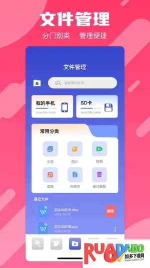 4、这款软件能极速搜索文件,输入关键词就能快速找到想查看的文件,还能直接对手机里的文档、图片、视频、音乐等文件按类型分类,满足用户多种需求。它看似简单,却能轻松满足用户使用手机的各种需求,挺不错的。