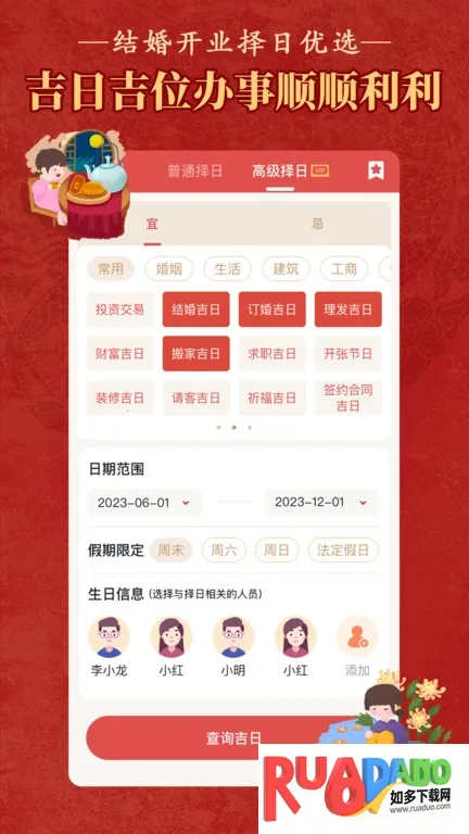 3、有喜庆择日服务,可选好日子办事,还能查询每日宜忌,利于学习传承传统文化。