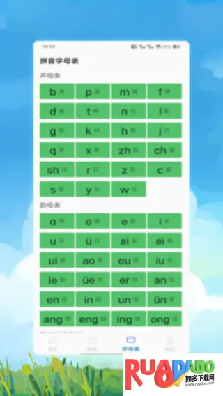 2、软件有详细的拼音字母表,小朋友点开字母能听发音,还能看到对应范例词,帮助理解和加深记忆。