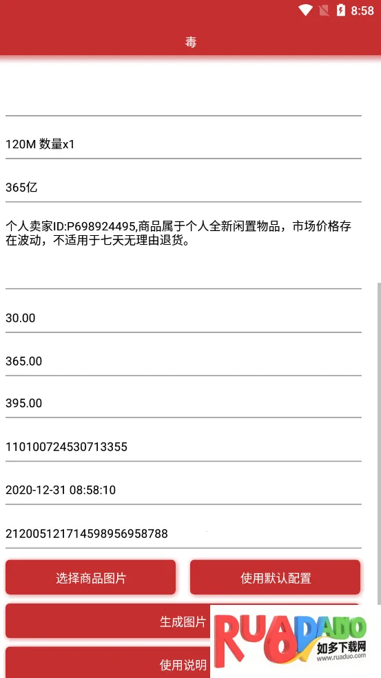 1、操作简单,只需在软件输入价格、交易时间、商品名称、商品图片、卖家 ID 等信息,就能一键生成得物购物截图,不知如何填写还可点击默认配置。