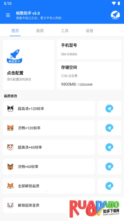 2、可修改游戏画质,还能按手机配置智能推荐合适的画质修改方案,还有语音包翻译大师物资代码等趣味小功能。