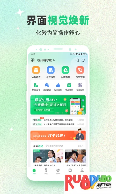 幸福绿城这款软件能很好解决大家对物业和园区管理的需求。它有物业缴费报修、社区公告、邻里交流、周边商家优惠等多个功能模块。业主用手机就能轻松缴纳物业费、报修房屋,还能第一时间了解园区动态,省时间又省精力。