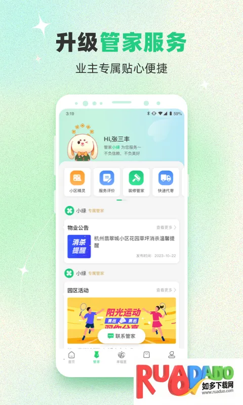 4、基于绿城优质资源,整合社会资源,以满足业主生活需求为核心,提供全生活维度的服务,还能让业主第一时间掌握快递信息、线上缴费、报名活动、积分兑换。