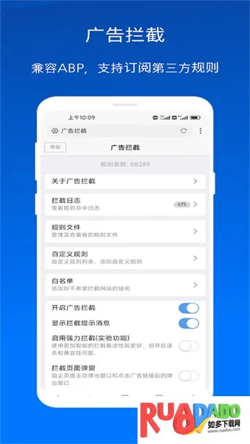 2、广告拦截:具备强大的广告拦截功能,可清除80%的恶意广告,还能导入自定义规则或ABP等第三方规则。