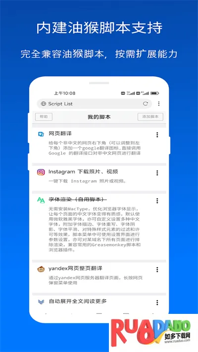 2、功能强大:虽占用内存小,但功能丰富,支持集成第三方下载器、播放器,内建支持油猴脚本,按需扩展能力,还有智能搜索、全屏阅读等。