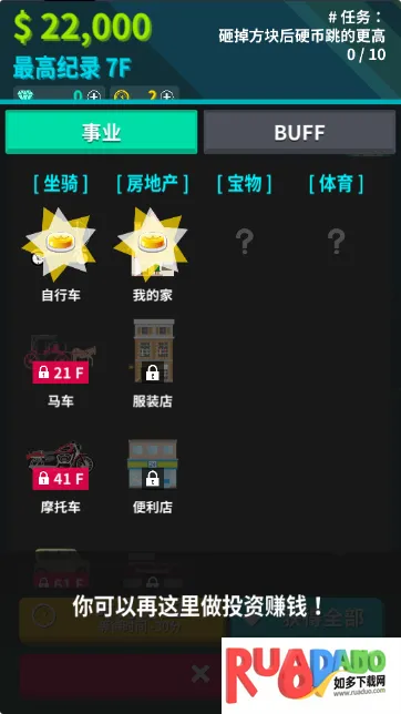 1、游戏玩法丰富多样,投资与闯关形成良性循环,能收集金币提升后续收益,还可避开障碍物收集道具。