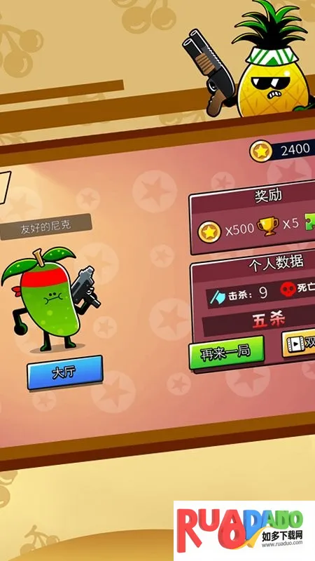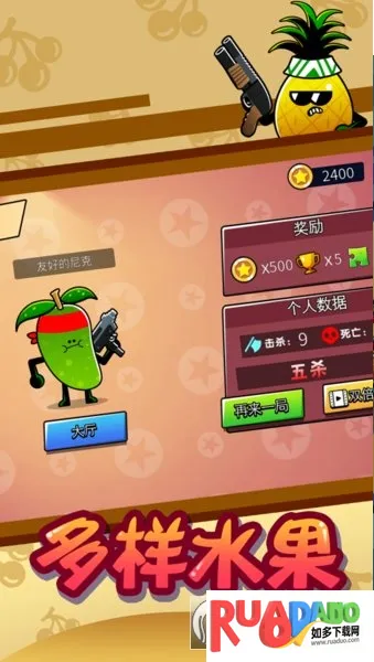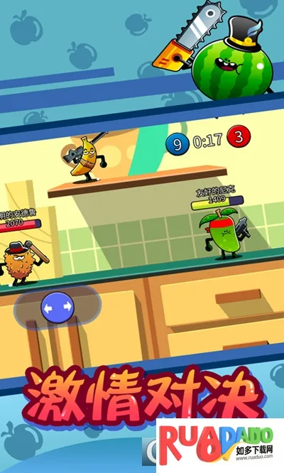 在游戏里,有不同场景,你能选择属性和攻击力各异的水果人战斗。可以通过商城和成就系统解锁更多角色、获得碎片来升级角色,增强战斗力。武器众多,能自由组合。游戏形式丰富,有对战和冒险模式,还有经典模式可自动匹配对手,让你一秒进入战斗。画面风格奇特,水果造型萌趣精致,还有免费皮肤可换。在休息时间玩上几局,能给你带来无限欢乐,快来体验吧!