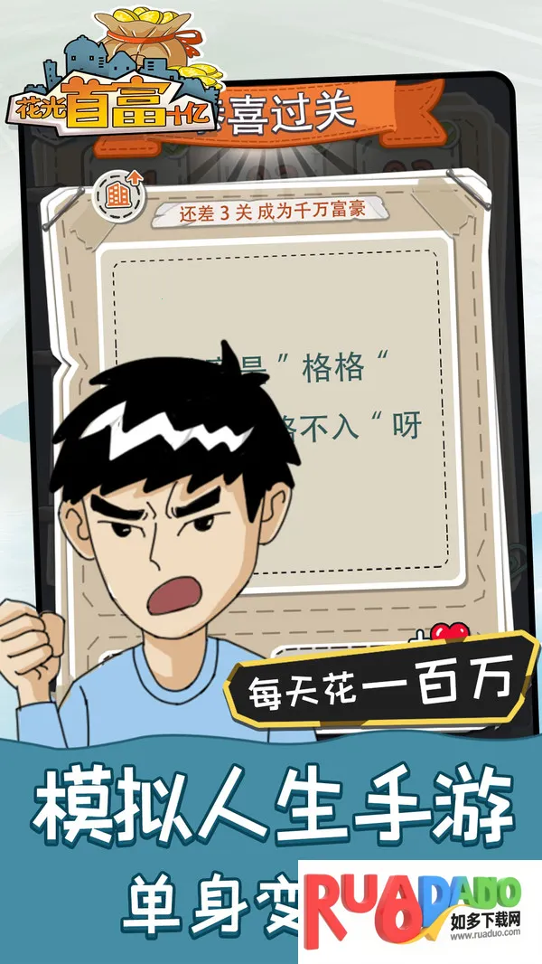 嘿,想体验一把独特的财富挑战吗?那就来试试“花光首富十亿”这款超有趣的游戏!在这里,你将化身首富,面临各种脑洞大开的题目关卡。通过回答问题、解决谜题,逐步消耗巨额财富。游戏题材丰富,涵盖常识、逻辑、趣味等多个领域,特别考验思维能力和反应速度。它有着低门槛设计,界面与操作简单,轻松就能上手。答题正确率还和虚拟收入挂钩,单题收益 100 万呢!而且还有进度门控系统,根据财富值解锁新内容。部分关卡需要你进行消费决策,解决资源管理难题。要是你在游戏中遇到难题,比如找苍蝇、救八戒这些关卡,别担心,这里有详细的答案攻略。有了这些答案,你就能更顺畅地闯关,尽情享受花光首富十亿的独特乐趣啦!快来下载体验吧!