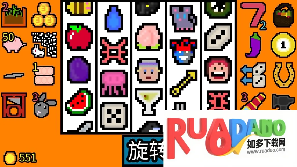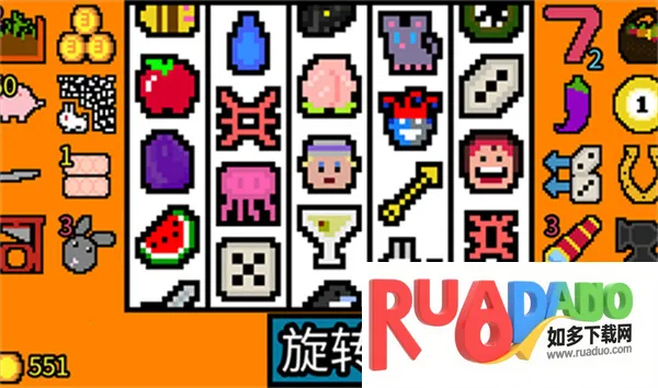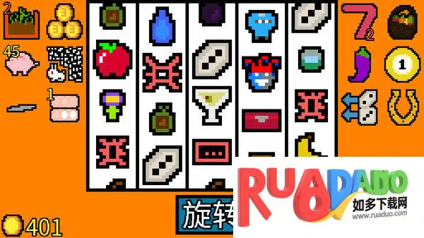 1. 这是一款像素风的roguelike策略模拟经营游戏,玩家要通过幸运机转动组合符号获金币交房租。
