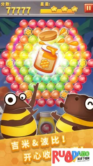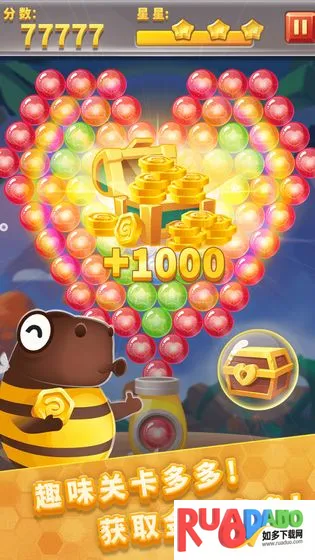 3. 能解救被困小猫,通过调整射击角度发射水果泡泡消除。