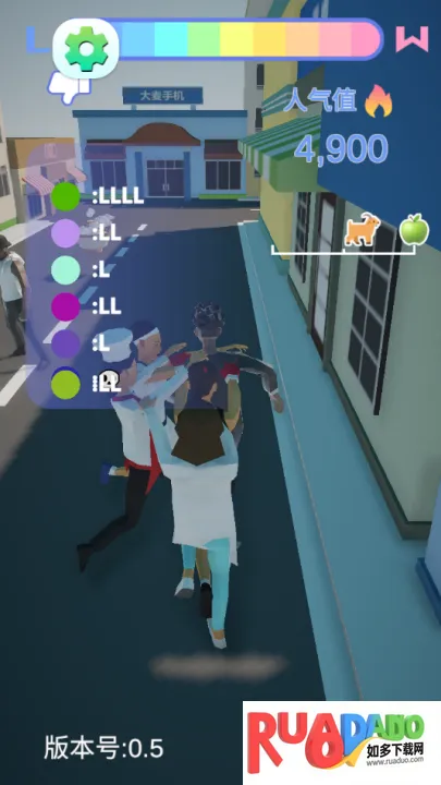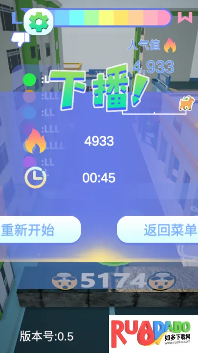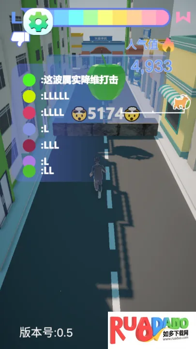 2、游戏整体属于轻松搞笑风格的跑酷类玩法,画面左侧会不断滚动弹幕,右侧则显示当前人气值。